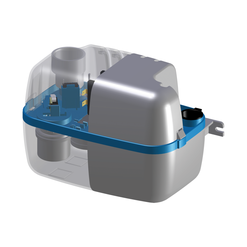 Overhevelunit voor het overhevelen en afvoeren van condensaat uit airconditioners, koelinstallaties en condensatieketels. De belangrijkste voordelen zijn hoge prestaties en betrouwbaarheid. SANICONDENS Pro bestaat uit een pomp, een overhevelkamer met een vlotter die de pomp inschakelt, en een tweede vlotterschakelaar die een extern alarm inschakelt (indien beschikbaar).