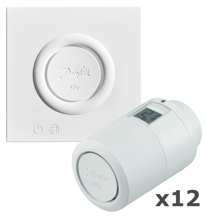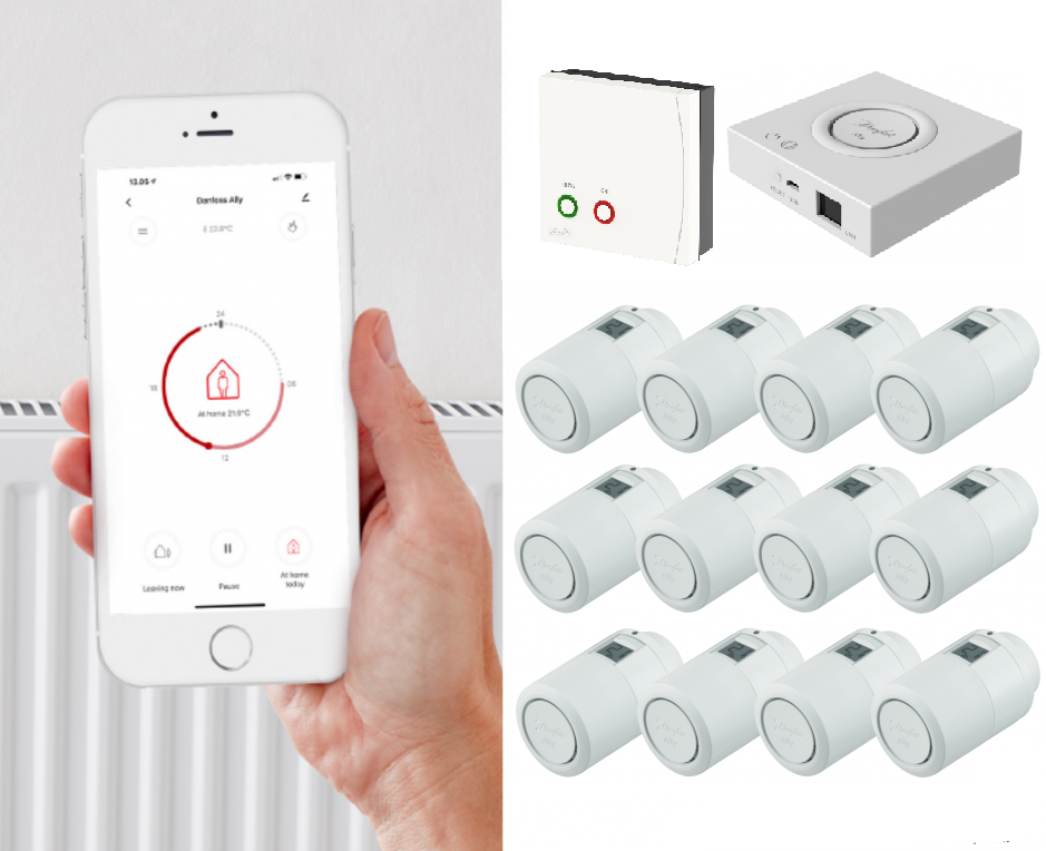 De starterskit voor slimme verwarming bevat de centrale eenheid Danfoss Ally Gateway, een relaisunit voor ketels en een elektronische draadloze knop Danfoss Ally. Het systeem is geschikt voor huishoudens zowel voor radiatorverwarming als voor vloerverwarming.