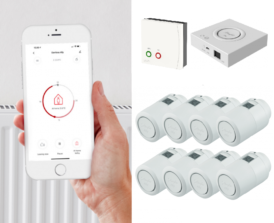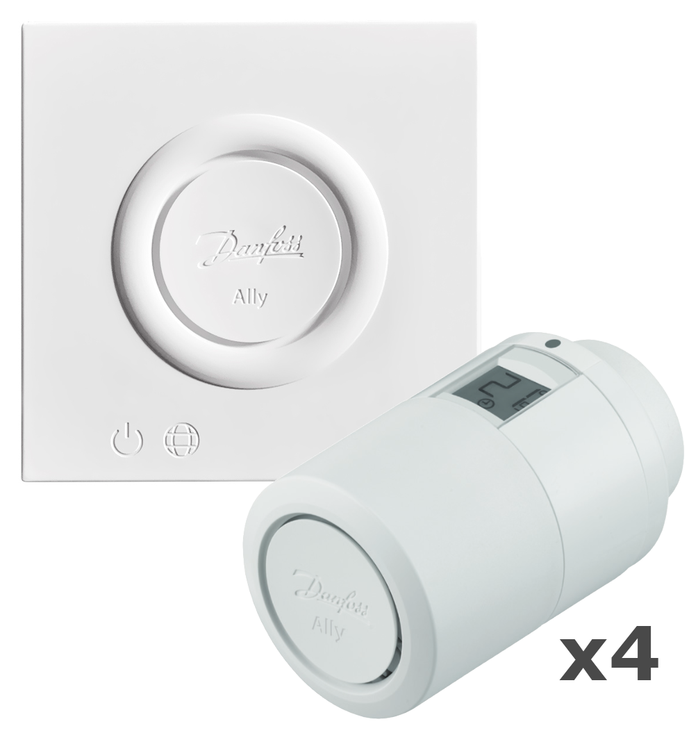 De startersset voor slimme verwarming bevat de centrale eenheid Danfoss Ally Gateway, een relaisunit voor ketels en een elektronische draadloze thermostaatknop Danfoss Ally. Het systeem is geschikt voor huishoudens zowel voor radiatorverwarming als voor vloerverwarming.