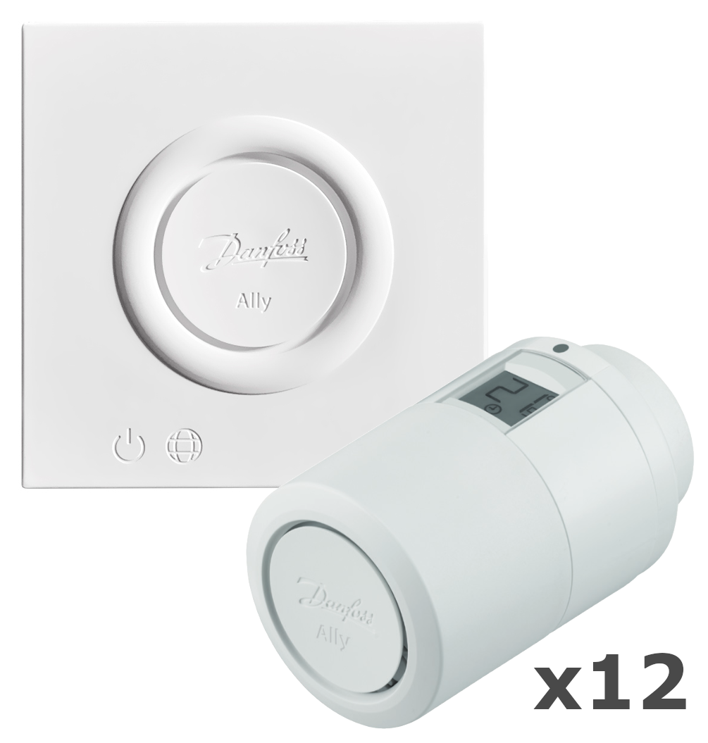 De starterskit voor slimme verwarming bevat de centrale eenheid Danfoss Ally Gateway en de elektronische draadloze thermostaatknop Danfoss Ally. Het systeem is geschikt voor huishoudens zowel voor radiatorverwarming als voor vloerverwarming.