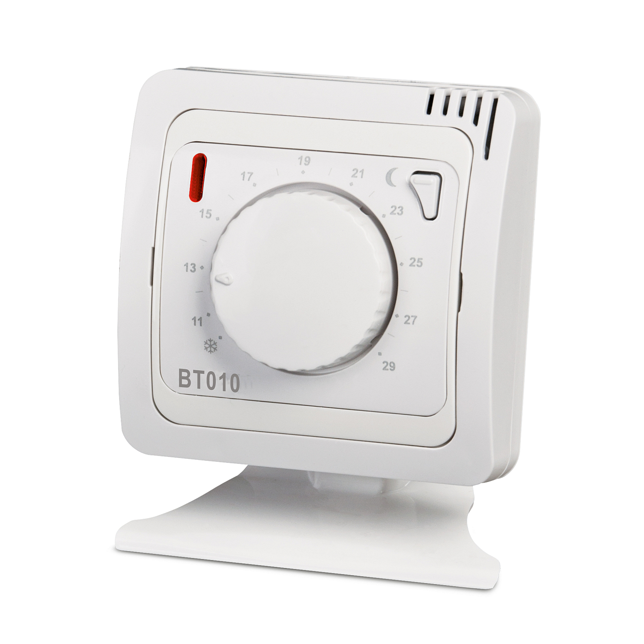 Digitale draadloze thermostaat Elektrobock BPT013 met een zelflerend codesysteem en eenvoudige bediening via een draaiknop met een ontvanger voor in het stopcontact. Uitgerust met een nieuwe functie voor automatische nachtverlaging van 3 °C gedurende 8 uur.