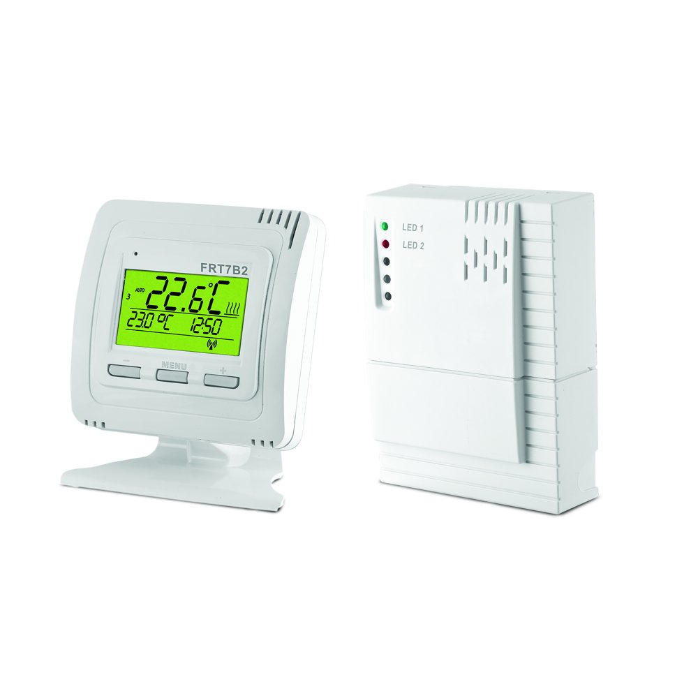 De digitale draadloze thermostaat Elektrobock FRT7B2 is een set van een draadloze thermostaat - zender (monitort de temperatuur in een specifieke ruimte) en een schakelelement - ontvanger (bedient de aangesloten warmtebron volgens de temperatuurvereisten).