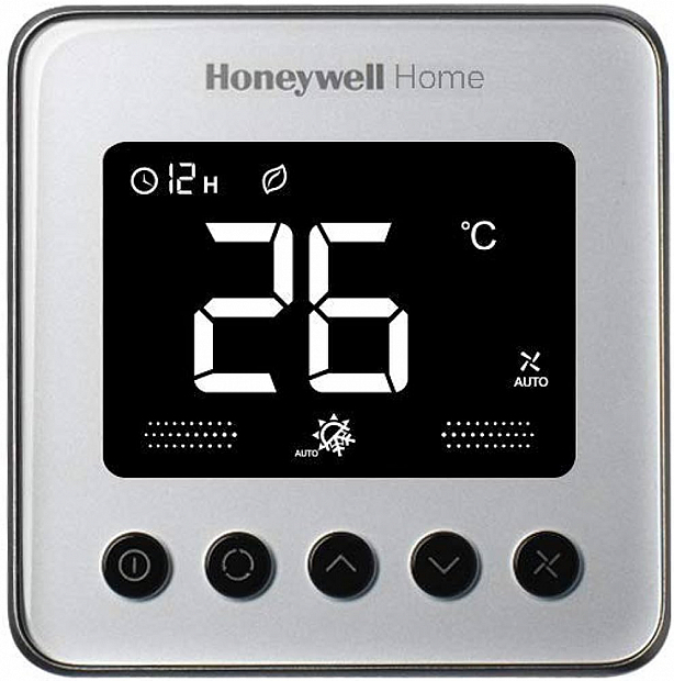 Zilverkleurige geslepen thermostaat Honeywell Orchid 3 (TF428LN-RSS-U) voor fancoil-units met een twee- of vierpijpsysteem. Meer informatie