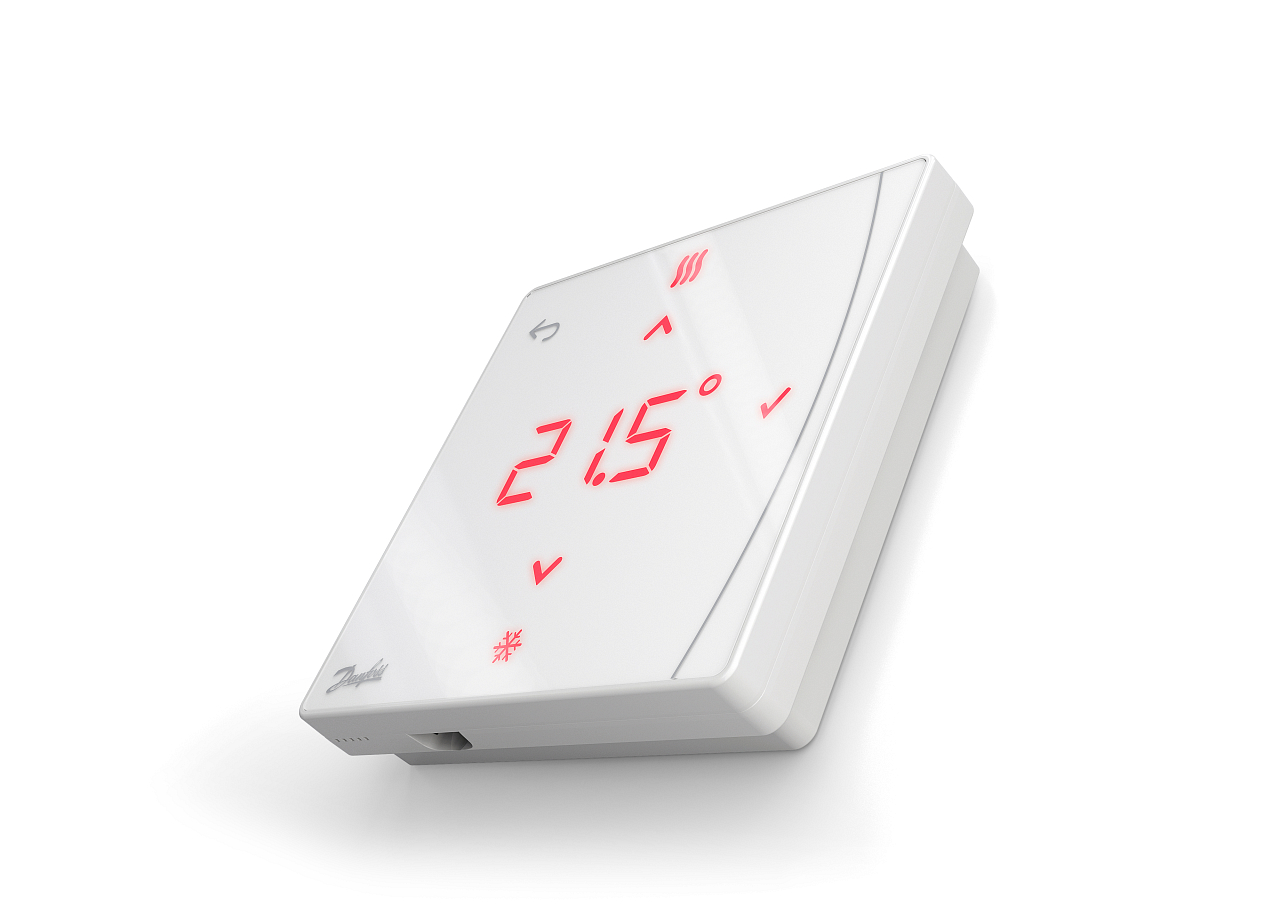 Draadloze ruimtethermostaat Danfoss Icon2 regelt vloerverwarming via bediening op een touchscreen, dat na 10 seconden inactiviteit uitschakelt en door een lichte veegbeweging weer activeert. Op het scherm kan de exacte gewenste temperatuur in het bereik van 5-35 °C worden ingesteld. Deze wordt gemeten door een infrarood vloersensor, die zorgt voor een zeer nauwkeurige regeling van de vloerverwarming. De gemeten temperatuur wordt op het scherm weergegeven.