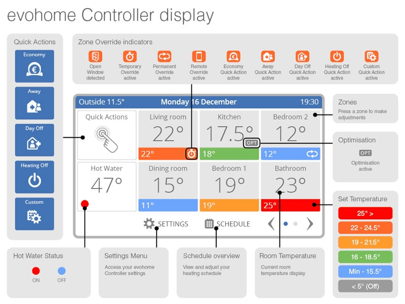 Dankzij het Evohome-systeem krijgt u de mogelijkheid om de temperatuur in elke kamer van het huis of appartement te regelen volgens een vooraf ingesteld wekelijks tijdschema. Daarbij heeft u de mogelijkheid om de temperatuur op elk moment aan te passen aan uw behoeften. Het zonesysteem voor verwarming zorgt ervoor dat in elke kamer van het huis, appartement, winkel of kantoor op het gewenste tijdstip de temperatuur heerst die u vooraf voor de afzonderlijke dagen van de week heeft ingesteld.