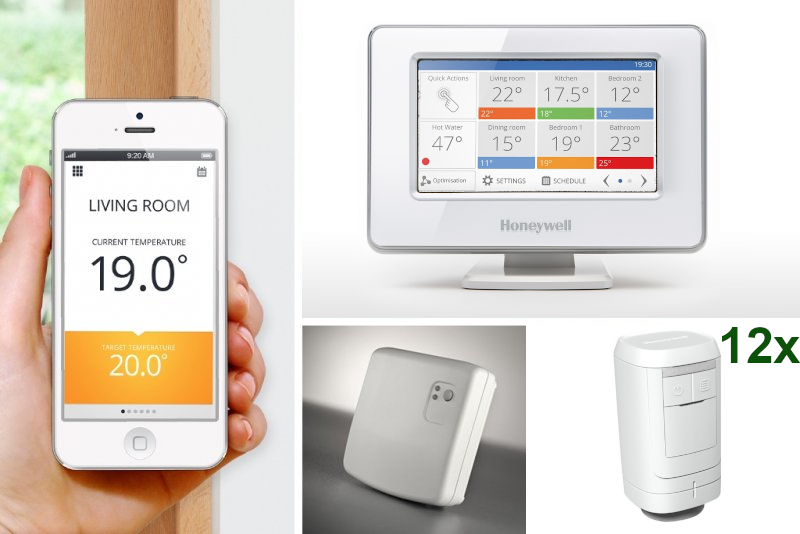 Honeywell Evohome - WiFi set L-12 voor slimme verwarmingsregeling van gezinswoningen, appartementen en kantoren. De set L-12 bevat 12 draadloze thermostaatknoppen en is daarmee een voordelige oplossing voor appartementen. Meer informatie