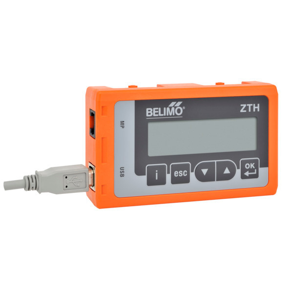 Instelapparaat voor parametrering en communicatie. Wordt aangesloten op aandrijvingen, VAV-regelaars, HVAC-vermogenstoestellen en brandkleppen van Belimo. Na aansluiting wordt het bedieningsmenu gestart en worden de gegevens van het aangesloten apparaat geladen. De beschikbare instellingsopties zijn afhankelijk van het type aangesloten apparaat en worden gespecificeerd in de bijbehorende documentatie. Het instelapparaat toont echter altijd alleen de instellingsopties die voor het betreffende apparaat mogelijk zijn. Parameters die niet in het apparaat kunnen worden ingesteld, worden door de ZTH EU helemaal niet weergegeven.