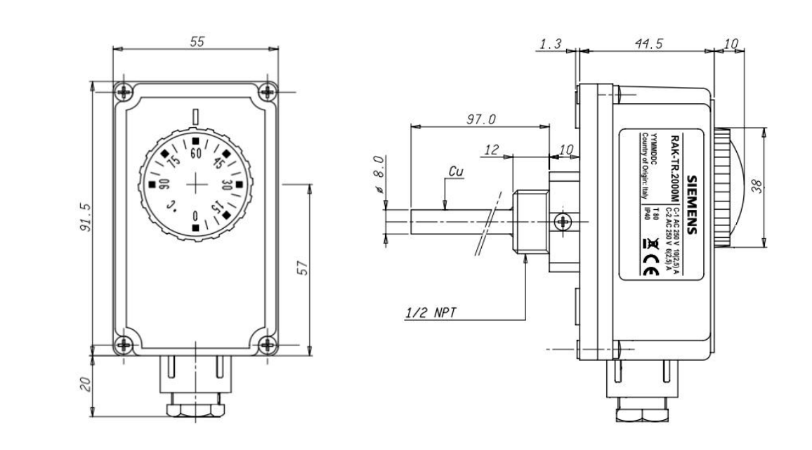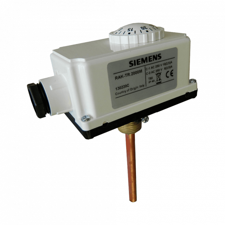 Onderdompelthermostaat Siemens RAK-TR.2000M voor het regelen en beperken van de temperatuur met behulp van een enkelpolige schakelaar met een temperatuurinstelbereik van 0...90°C. Meest voorkomende toepassing in verwarmingssystemen (voor het regelen en beperken van de watertemperatuur, het schakelen van ketels, pompen, kleppen, enz.).