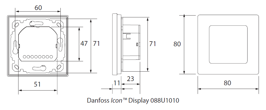 De moderne ruimtethermostaat Danfoss Dial, behorend tot de Danfoss Icon-familie, regelt de vloerverwarming via bediening op een touchscreen, waarop de gewenste temperatuur in het bereik van 5-35 °C nauwkeurig kan worden ingesteld. Het scherm dient ook om de huidige kamertemperatuur weer te geven. Kan zelfstandig worden gebruikt of worden aangesloten op de regelaar Master Controller. Via de relaisuitgang kan hij tot 5 thermo-elektrische aandrijvingen aansturen. Het scherm is normaal gesproken uitgeschakeld en wordt geactiveerd door er met een vinger overheen te vegen. Er is een ingebouwde vorstbeschermingsfunctie (5 °C).