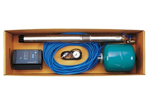 Set van SQE 3-105 dompelpomp, drukvat, sensor en besturingseenheid. H=140m, Q=4,4 m3/u, voeding 230V. Meer informatie