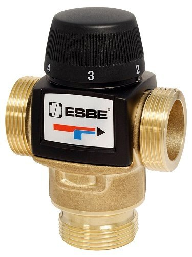 Thermostatische mengkraan ESBE. Instelbaar temperatuurbereik 20-55 °C. Afmeting DN 20, aansluiting buitendraad G 1". Meer informatie