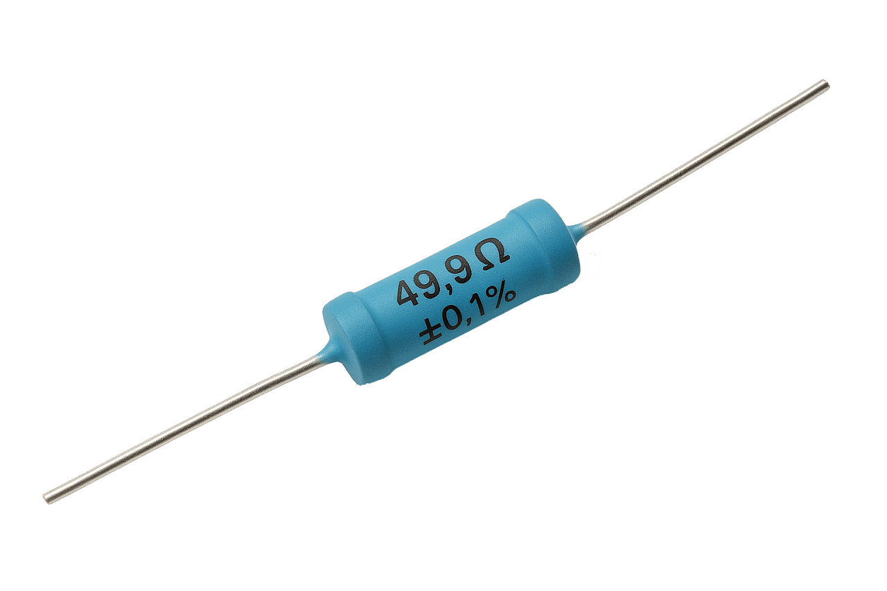 Nauwkeurige THT-weerstand Evikon 49,9 Ω ±0,1 %, 1/4 W voor meet- en referentietoepassingen met hoge stabiliteit. AI-afbeelding. Meer informatie