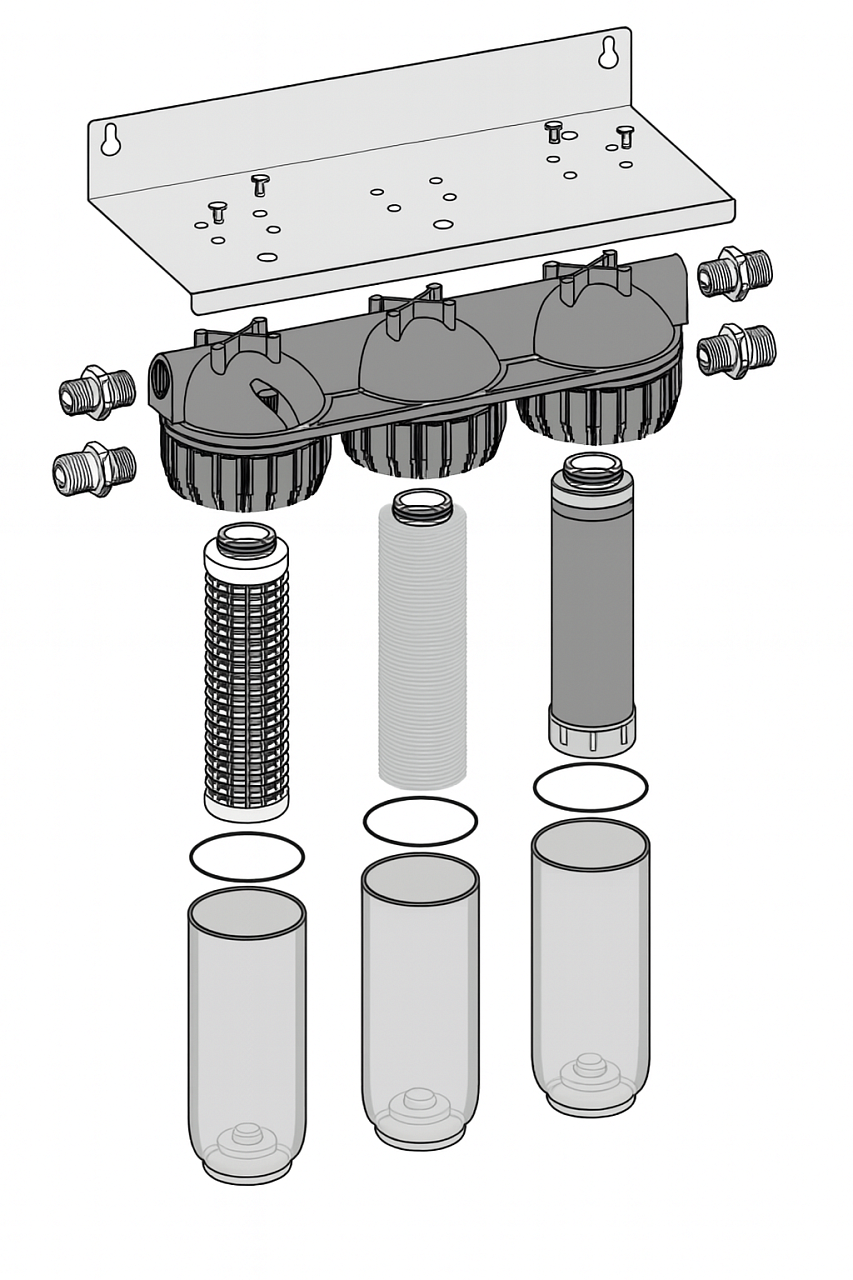 Het water stroomt zowel door het wasbare voorfilter als door de fijne zeef van de filter, waarbij de deeltjes aan de buitenkant worden opgevangen. In het volgende deel stroomt het water door het actief koolpatroon, dat fijne deeltjes filtert en onaangename geuren en smaken veroorzaakt door chloor of andere stoffen verwijdert. Het verwijdert ook pesticiden, insecticiden en gechloreerde oplosmiddelen. Om hygiënische redenen moeten de filterpatronen elke 6 maanden worden vervangen, vervanging van het voorfilter wordt aanbevolen na 2 jaar of na de derde spoeling.