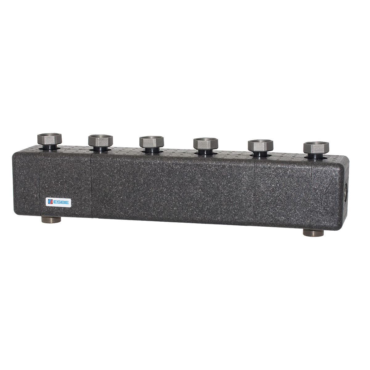 Verdeler voor pompgroepen met een aansluitmaat DN 25-32 van de serie GxA100. Wordt geleverd in een isolatiebehuizing en met beugels voor wandmontage. De verdeler is kleurgecodeerd om de installatie zo eenvoudig mogelijk te maken.