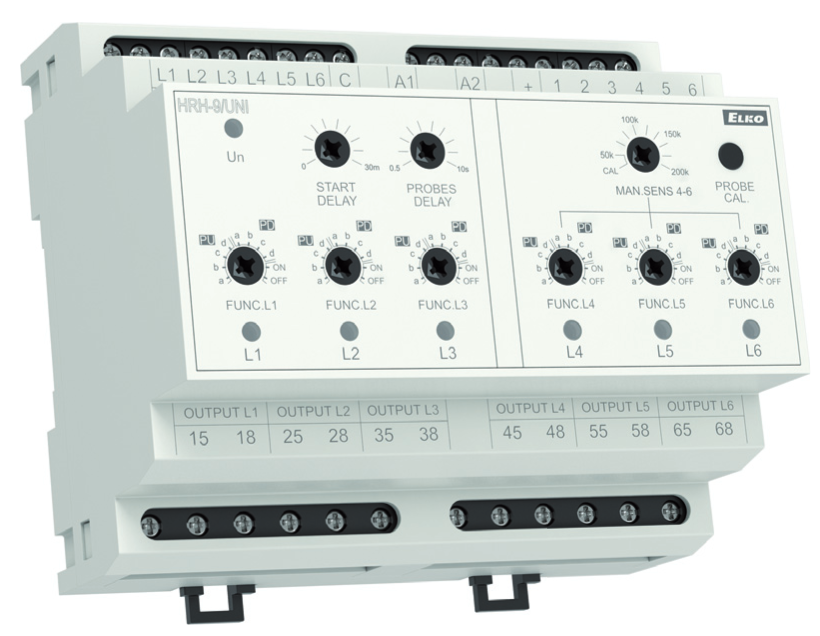 Vlotterschakelaar met IP40-bescherming, ontworpen voor het bewaken van maximaal zes niveaus in putten, putten, tankers, watertanks en andere. Aan de schakelaar kunnen maximaal 6 niveausensoren worden aangesloten (en één gemeenschappelijke). Elke sensor wordt individueel bewaakt en kan afzonderlijk worden ingesteld. Voor de sensoren L4, L5 en L6 kan de gevoeligheid handmatig worden ingesteld. Voor alle sensoren samen kan de inschakelvertraging worden ingesteld in het bereik van 0,5-10 s.