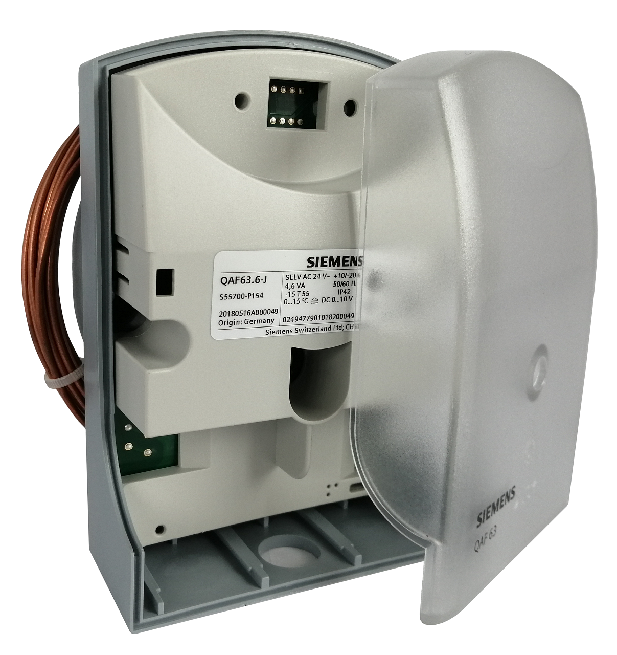 Vorstbeveiligingssensor QAF 63.6 voor gebruik in een luchtkanaal. Het betreft een actieve sensor met een uitgang van 0-10V. Wordt gebruikt in ventilatie- en airconditioningssystemen waar er gevaar is voor bevriezing door inkomende buitenlucht.
